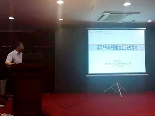 湖北神力鍛造有限責任公司技術部部長李環(huán)宇從轉向節(jié)概述、轉向節(jié)的鍛造和加工工藝、轉向節(jié)鍛件對加工工藝性的影響介紹了公司產品生產情況,做了題為《商用車轉向節(jié)鍛件加工工藝性探討》的報告。