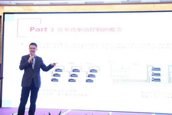 惠州市仨聯(lián)自動化設備有限公司總經理唐勇向大家介紹“分布式驅動控制技術在沖壓機器人上的應用”。