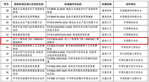 2021年12月30日,工業(yè)和信息化部公布111項(xiàng)2021年團(tuán)體標(biāo)準(zhǔn)應(yīng)用示范項(xiàng)目,中國(guó)鍛壓協(xié)會(huì)發(fā)布的 T/CCMI 6-2020《進(jìn)口三聯(lián)熔煉718(GH4169)鍛制棒材》團(tuán)體標(biāo)準(zhǔn)成功入選。