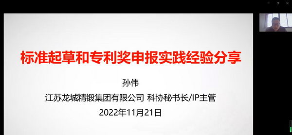 江蘇龍城精鍛集團有限公司主管孫偉做了題為《標準起草和專利獎申報實踐經(jīng)驗分享》的報告。分享了企業(yè)標準制訂方面的經(jīng)驗以及資源配置、注意事項等,并全面介紹了企業(yè)在中國專利獎申報過程中申報內(nèi)容重點及注意事項等,內(nèi)容豐富,具有很強的實際指導借鑒意義。