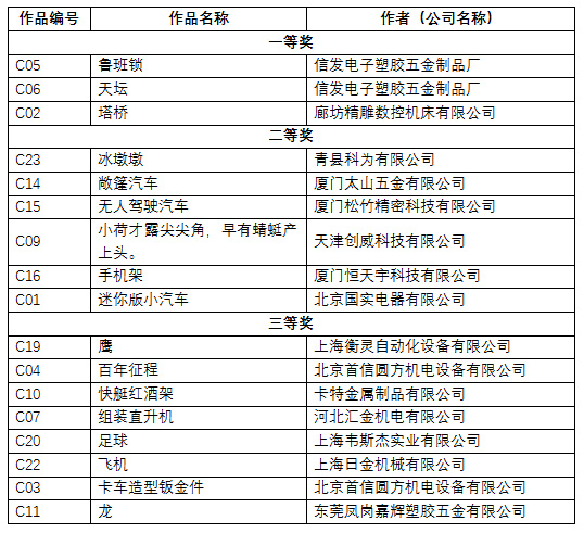 經(jīng)過線上觀眾評審、線下觀眾評審、專家評審三個(gè)環(huán)節(jié)的投票,大賽共產(chǎn)生單體作品組一等獎(jiǎng)4項(xiàng)、二等獎(jiǎng)7項(xiàng)、三等獎(jiǎng)10項(xiàng);組合件作品組一等獎(jiǎng)3項(xiàng)、二等獎(jiǎng)6項(xiàng)、三等獎(jiǎng)8項(xiàng);工藝造型作品組一等獎(jiǎng)3項(xiàng)、二等獎(jiǎng)6項(xiàng)、三等獎(jiǎng)8項(xiàng);學(xué)生作品組一等獎(jiǎng)2項(xiàng)、二等獎(jiǎng)3項(xiàng)、三等獎(jiǎng)5項(xiàng)。10件優(yōu)秀作品送日本參加第35屆優(yōu)秀鈑金產(chǎn)品技能大賽進(jìn)行展示。