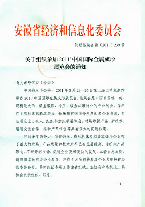 安徽省經(jīng)濟(jì)和信息委員會(huì)發(fā)文支持中國(guó)國(guó)際金屬成形展