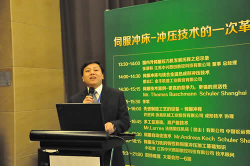 江蘇中興西田數(shù)控科技有限公司董事總經(jīng)理張清林先生為本次會議做主題報告“國內(nèi)外伺服壓力機發(fā)展歷程之啟示錄” ;金豐公司作為成形技術(shù)整合解決方案的全球領(lǐng)導廠商,一直致力于新技術(shù)的研發(fā),金豐機器工業(yè)股份有限公司研發(fā)經(jīng)理蔡志仁先生則帶來“伺服沖床與鎂合金溫熱成形沖壓技術(shù)”報告。