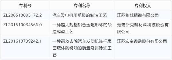 2020年7月14日,國(guó)家知識(shí)產(chǎn)權(quán)局發(fā)布了第二十一屆中國(guó)專(zhuān)利獎(jiǎng)授獎(jiǎng)決定,江蘇龍城精鍛有限公司、無(wú)錫派克新材料科技股份有限公司、江蘇宏寶鍛造股份有限公司三家企業(yè)獲獎(jiǎng)。獲獎(jiǎng)專(zhuān)利號(hào)和專(zhuān)利名稱(chēng)如下: