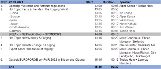 歐洲鍛造聯(lián)盟線上會(huì)議于9月22日通過線上形式召開,會(huì)議內(nèi)容涉及相關(guān)國家鍛造行業(yè)熱點(diǎn)及發(fā)展趨勢(shì)分析,中國鍛壓協(xié)會(huì)張金秘書長在會(huì)上做了“中國鍛造行業(yè)發(fā)展”報(bào)告,詳細(xì)日程見下表。